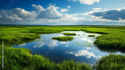 Fototapeta premium Stunning Landscape: Serene Meadow with Cloud Reflections