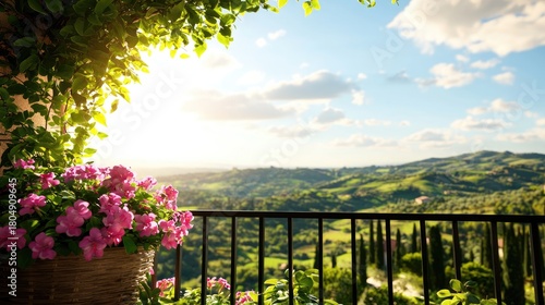 Obraz premium Stunning Landscape View from Balcony with Flower Pot and Sunlight