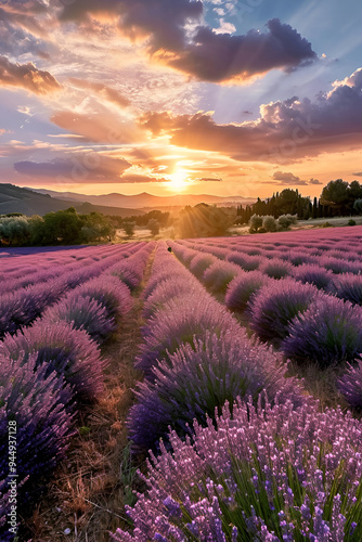 © Shanza, Obraz premium Stunning landscape with lavender field at sunset. magical shades of purple and pink ,a wide shot of lavender fields at sunrise
