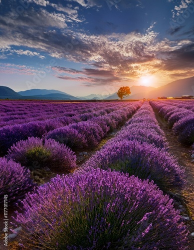 Fototapeta premium Stunning landscape with lavender field at sunset, Stunning lavender field landscape Summer sunset