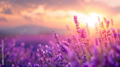 Naklejka premium Stunning Lavender Field at Sunset: A Breathtaking Natural Landscape