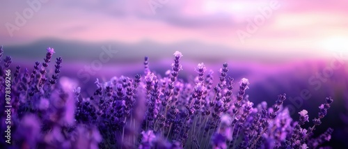 Naklejka premium Stunning Lavender Field at Sunset with Vibrant Purple Flowers and Soft Pastel...