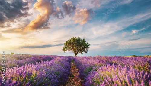 Naklejka premium Stunning lavender field landscape Summer sunset with single tree