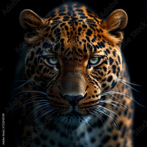 Fototapeta premium Stunning leopard portrait emerging from darkness. close-up of leopard face...