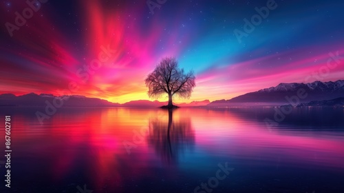 Obraz premium Stunning lone tree in a surreal, colorful sunset reflected on a calm lake,...