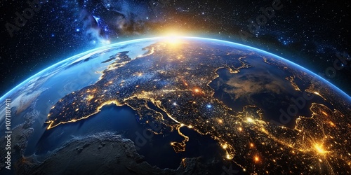 © Adisorn, Fototapeta premium Stunning Macro Photography of Earth from Space Showcasing Nighttime Lights and Vibrant City Glow in a Beautiful Celestial Setting, Capturing the Wonder of Our Planet from Above
