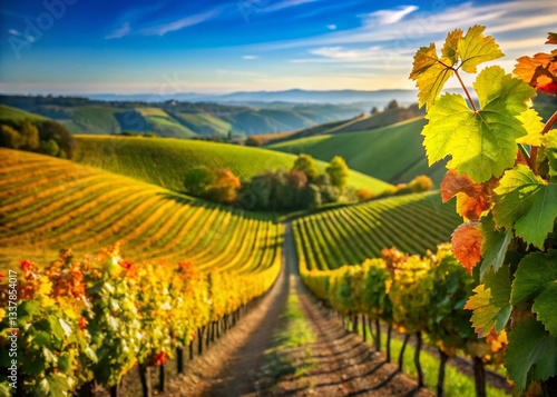 © Man888, Naklejka premium Stunning Macro Vineyard Landscape: Rolling Hills, Blue Sky, Grapevines