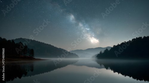 © Marin Studio, Fototapeta premium Stunning Milky Way galaxy reflecting in a serene lake at night
