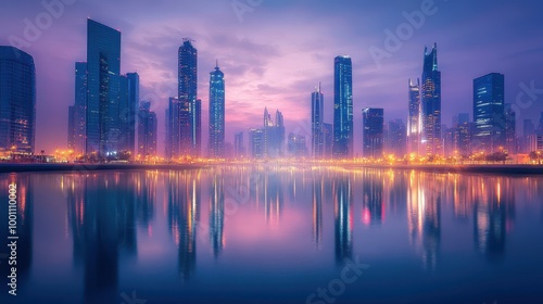 Fototapeta premium Stunning Modern City Skyline at Dusk with Reflections on Calm Water and...
