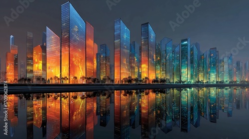 © ali, Fototapeta premium Stunning modern cityscape at dusk, glowing skyscrapers reflect vibrant lights on calm water surface.
