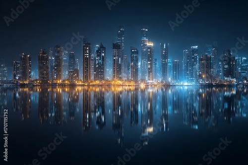 © Zakir, Fototapeta premium Stunning modern cityscape at night with vibrant lights reflecting on calm water creating a dramatic urban panorama