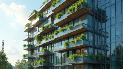 Obraz premium Stunning Modern Glass Office Building with Lush Green Terraces