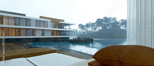 © Riya, Naklejka premium Stunning modern lakeside villa with sleek architecture and serene natural surroundings