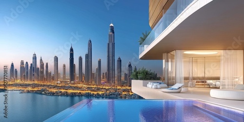 Obraz premium Stunning Modern Penthouse with Infinity Pool Overlooking Dubai Cityscape,...