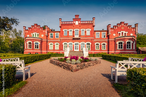 © Andrew Mayovskyy, Naklejka premium Stunning morning view of old red brick Mezmuiza castle, Latvia, Europe. Colorful summer scene of Augstkalne village, Dobele Municipality, Latvia, Europe. Traveling concept background.