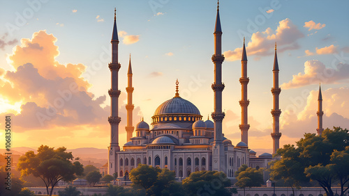 © Rman7ps, Obraz premium "Stunning Mosque Architecture at Sunset | Islamic Architecture and Cultural Heritage"