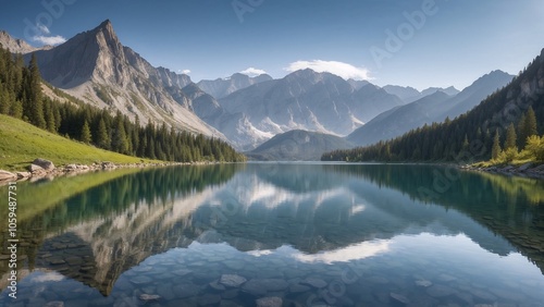 Fototapeta premium Stunning mountain lake reflecting the majestic peaks and clear blue sky in a tranquil setting