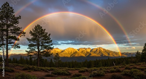 © Muzamil, Naklejka premium Stunning mountain landscape with vibrant double rainbow after the storm, a symbol of hope and new beginnings, ideal for travel, nature, and inspirational themes