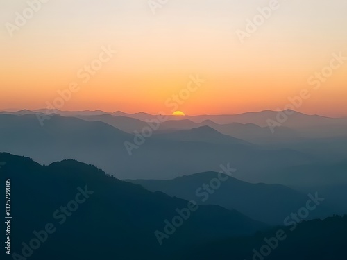 Fototapeta premium Stunning Mountain Sunset with Silhouetted Ridges and Vibrant Orange Sky -...