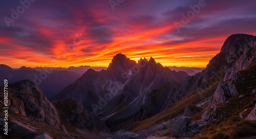 © Haider, Naklejka premium Stunning Mountain Sunset with Vibrant Sky and Rugged Peaks