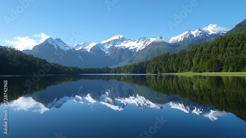 © Abubakar, Naklejka premium Stunning mountain vista reflects in clear lake surrounded by lush green forest