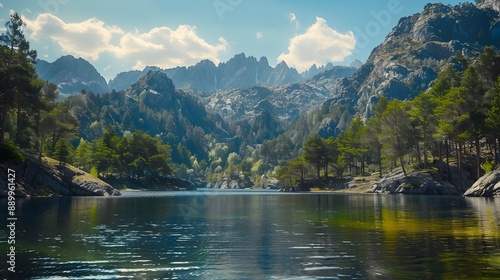 Fototapeta premium Stunning Mountainous Lake Surrounded by Lush Forested Landscape and Dramatic...