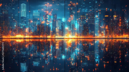 Obraz premium Stunning Night Cityscape with Reflections and Vibrant Lights Illuminating a...