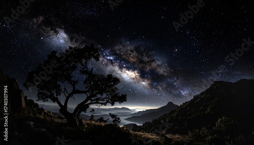 © Fandi, Naklejka premium Stunning night sky with milky way galaxy over a mountain landscape