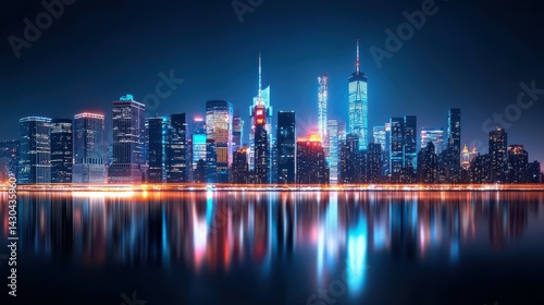 Fototapeta premium Stunning night skyline of a bustling city with vibrant lights reflecting on...