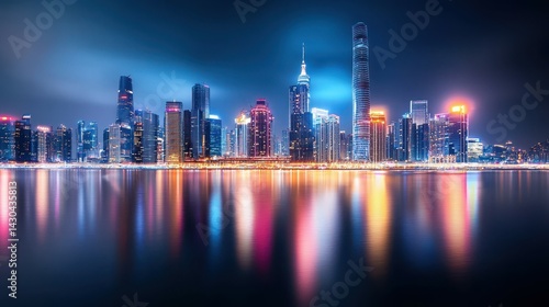 © Vangly, Fototapeta premium Stunning night skyline of a vibrant city reflecting on water.