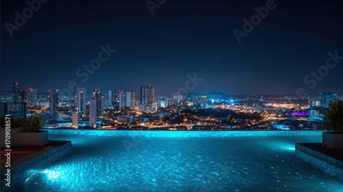 © buraratn, Obraz premium Stunning night view of city skyline illuminated by vibrant lights, featuring luxurious infinity pool that reflects shimmering water. scene evokes sense of tranquility and modern elegance