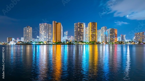 Naklejka premium Stunning Night View of City Skyline with Colorful Reflections