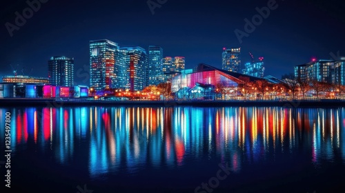 © Sirinya, Naklejka premium Stunning night view of London skyline with reflections of the lights on the River Thames, highlighting modern architecture.
