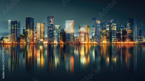 © Sirinya, Fototapeta premium Stunning night view of London skyline with reflections of the lights on the River Thames, highlighting modern architecture.