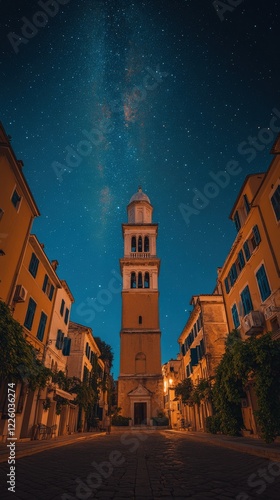 © Ross, Naklejka premium Stunning Nighttime View of Historic Church Tower Amid Starlit Sky in Charming Old Town Street - Capturing Architecture and Night Photography Marvel