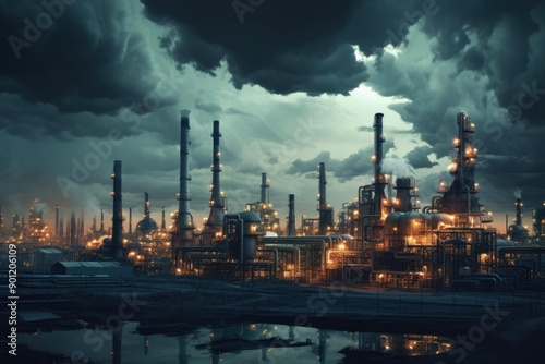 © juliars, Naklejka premium Stunning nocturnal view of a busy, illuminated industrial complex under a brooding, cloud-filled sky