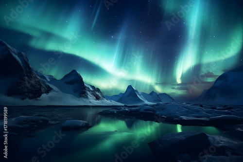 Naklejka premium Stunning Northern Lights Aurora Borealis over Arctic Sky, Vibrant Polar Night...