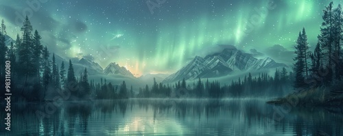 © Dalibor, Fototapeta premium Stunning Northern Lights illuminate night sky over mountains, reflecting on a serene lake.