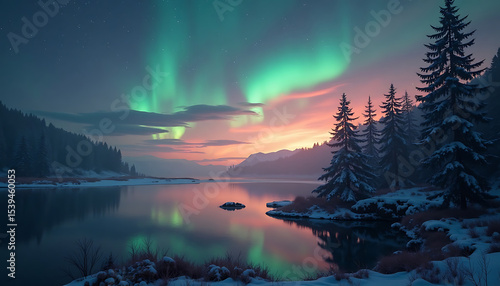 Fototapeta premium Stunning Northern Lights Over a Serene Winter Landscape with Trees and Lake