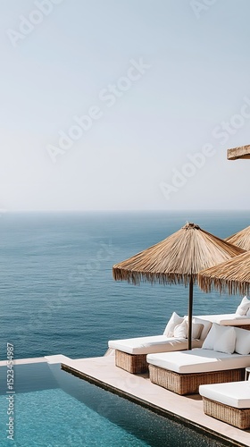 © Berkah, Fototapeta premium Stunning oceanfront poolside lounge area.