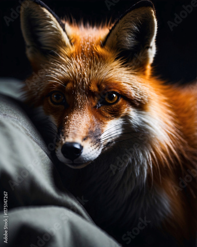 © SecretCanvas, Fototapeta premium Stunning orange fox in professional quality portrait set against dark shadows