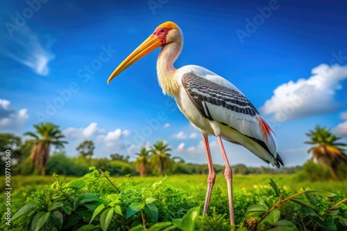 © Danicha, Fototapeta premium Stunning Painted Stork Bird Standing Gracefully in Lush Green Habitat Under Bright Blue Sky