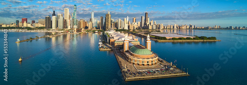 Fototapeta premium Stunning panorama of entire Navy Pier on Lake Michigan in Chicago with skyline during morning light