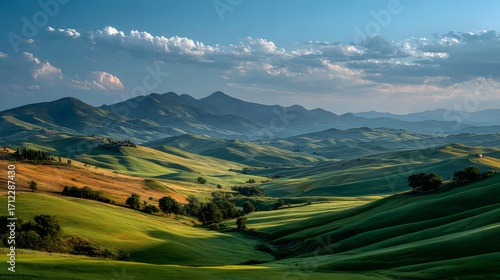 Fototapeta premium Stunning, panoramic photograph of the rolling green hills of Tuscany in late spring, bathed in warm afternoon sunlight that creates soft shadows, under a vast blue sky with wispy clouds.