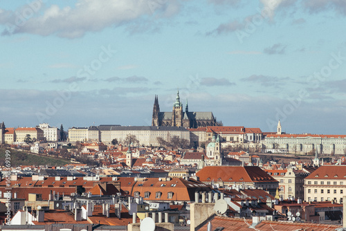 Fototapeta premium Stunning panoramic shot of Prague Castle set against the sky, overlooking traditional rooftops, showcasing the beauty of Czech architecture.