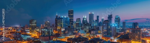 Obraz premium Stunning panoramic view of a city skyline at twilight with illuminated...