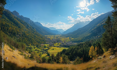 © Vergiliy, Obraz premium Stunning panoramic view of alpine valley with vibrant greenery and mountains.