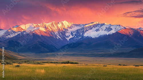 © Nelson, Fototapeta premium Stunning Panoramic View of Snow Capped Mountains at Sunrise