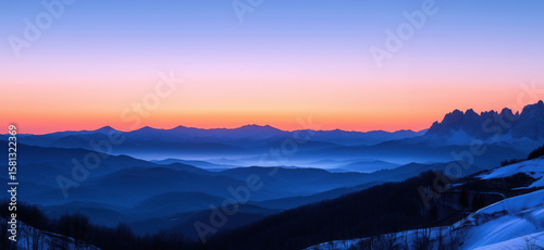 © Vergiliy, Obraz premium Stunning panoramic view of snow-covered mountains at dawn with vibrant colors.
