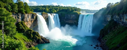 Naklejka premium Stunning panoramic view of tall waterfall surrounded by greenery, tranquil,...